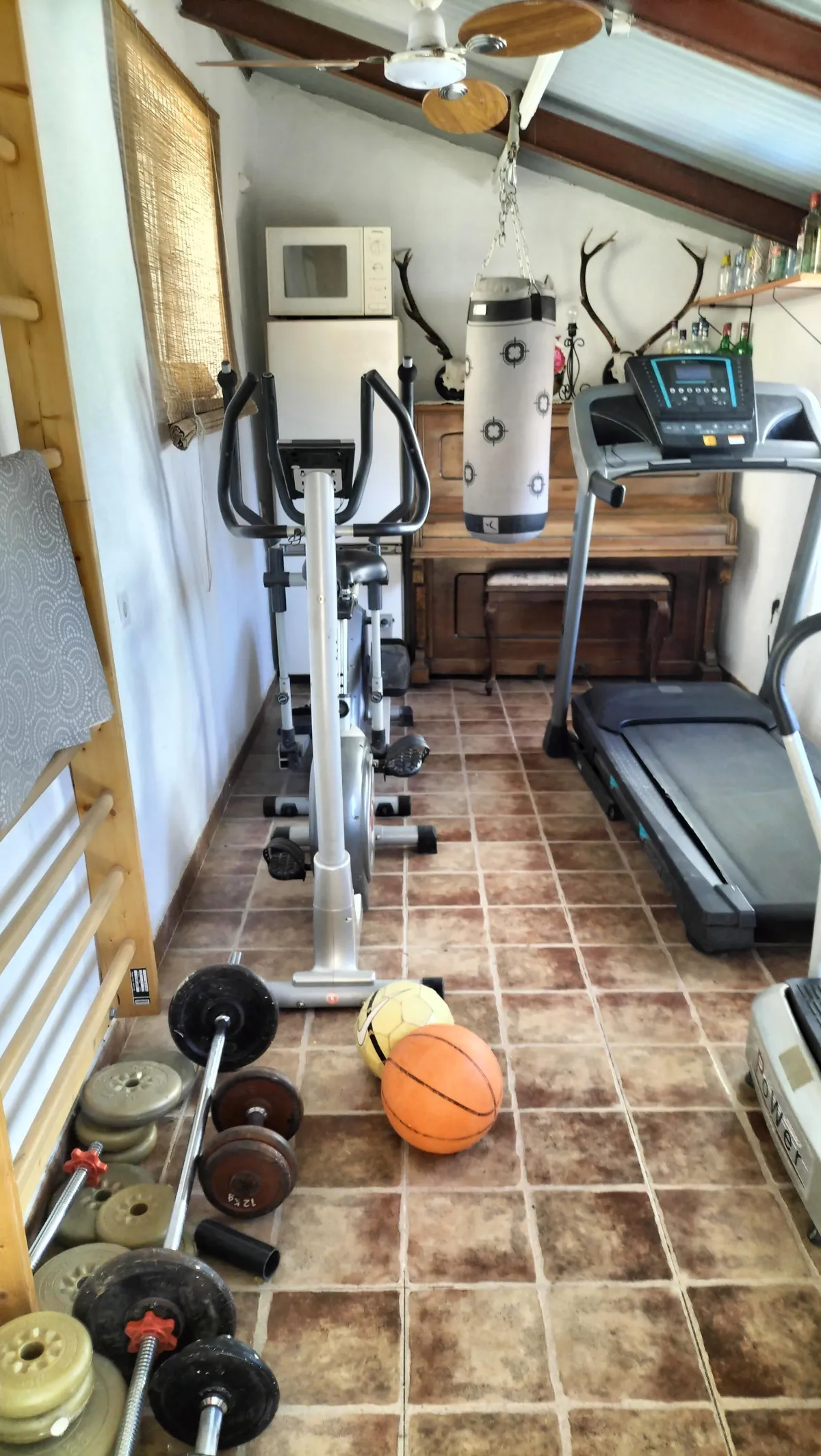 Dispone de cinta de correr, bicicleta estática, plataforma vibratoria, saco de boxeo, pesas, espaldera y esterilla, ofreciendo opciones tanto para entrenamiento cardiovascular como de fuerza y estiramientos.
